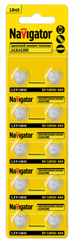 Главная/ Каталог продукции / Батарейки, аккумуляторы, зарядные устройства / Гальванический элемент / Элемент питания алкалиновый "таблетка" 95 670 NBT-13 (LR45 AG9 LR936 BP10) (блист.10шт) Navigator 95670