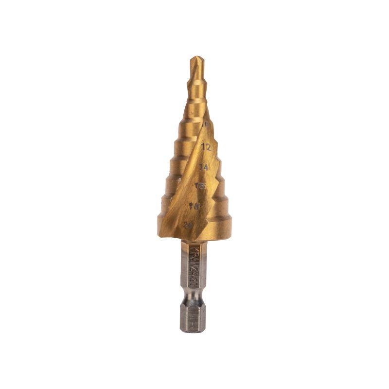 На каждой из 9 ступеней сверла нанесена маркировка фактического диаметра. Диапазон ступеней: 4, 6, 8, 10, 12, 14, 16, 18, 20 (шаг 2 мм).