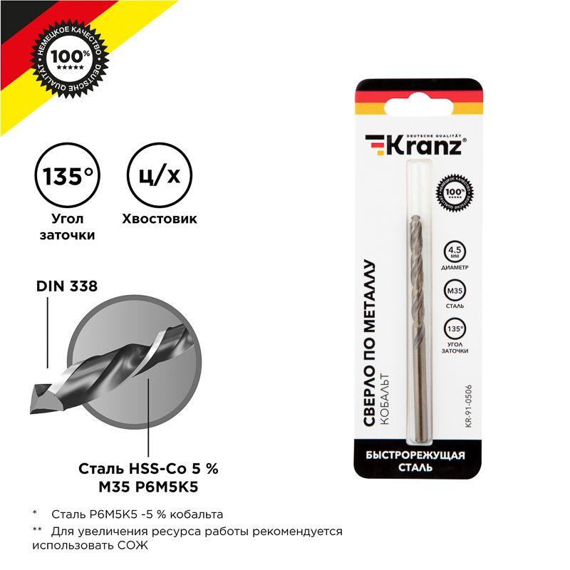 Сверло по металлу 4.5мм "Кобальт" (сталь HSS-Co 5% M35 P6M5K5) DIN 338 (блист.1шт) Kranz KR-91-0506