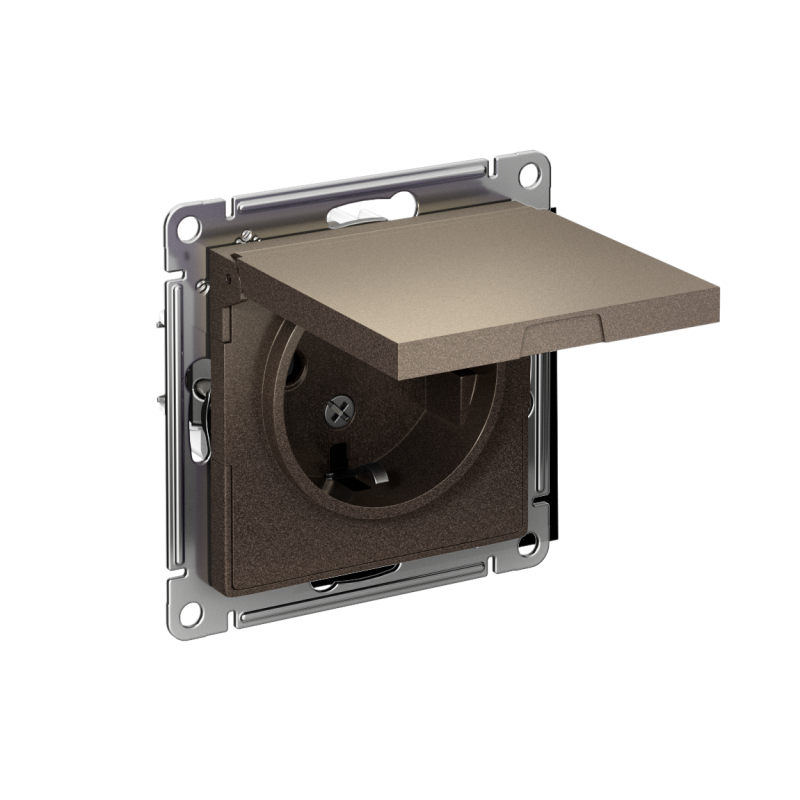 Главная/ Каталог продукции / Электроустановочные изделия / Розетка штепсельная / Розетка 1-м СП AtlasDesign 16А IP20 с заземл. защ. шторки с крышкой механизм мокко SE ATN000646
