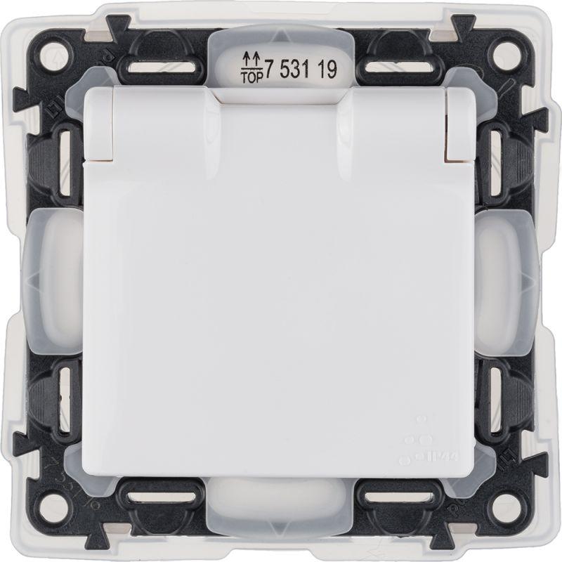 Механизм розетки Valena Life 2К+З защ. шторки и откидной крышкой IP44 бел. Leg 753119 – электроустановочный механизм. Представляет собой розетку из пластика, с лицевой панелью белого цвета, скрытой установки, монтируемый под штукатурку, на глубине не менее 50 мм. Предусмотрены защитные шторки, автоматически закрывающие гнезда розетки при вынутой вилке, и откидная крышка.