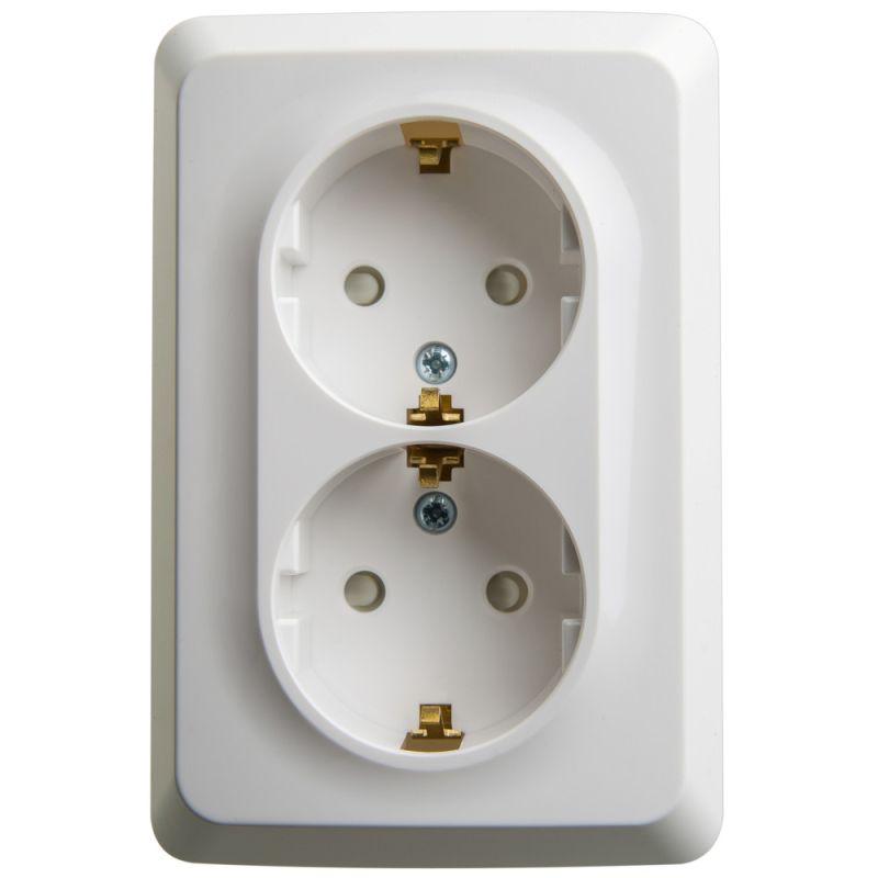 Розетка Systeme Electric (ранее Schneider Electric) ЭТЮД (белый, открытой установки) двухместная угловая с заземлением и шторками предназначена для применения в сетях до 250В, на ток до 16А. Ее конструкция позволяет установить розетку в угол помещения. Шторки и заземление обеспечивают дополнительную безопасность при косвенных прикосновениях. Сделано в России.
