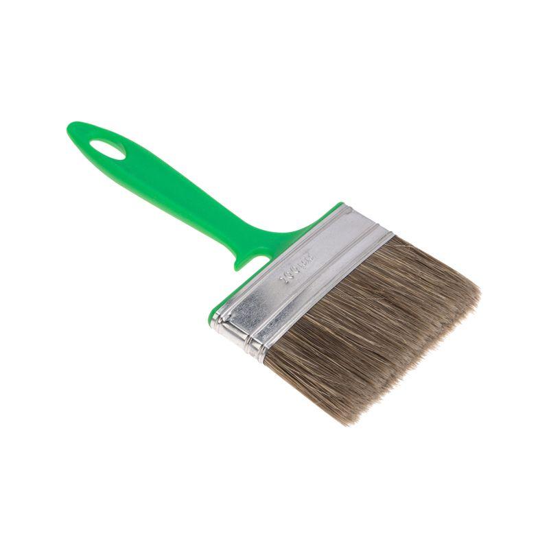 Кисть «Работы по дереву» отлично работает по шероховатым поверхностям, обладает износостойкой смешанной щетиной, отлично покрывающей дерево пропитками, глазурями и краской. Может применяться с эмалями и для проведения фасадных работ. Эргономичная пластиковая ручка кисти удобна в применении. Средний размер кисти позволяет равномерно прокрасить плоские поверхности, стены и потолки. Технические характеристики: Тип: кисть плоская Размер кисти: 100х12 мм Длина щетины: 57 мм Длина ручки: 130 мм Материал рукояти: пластик Материал бандажа: металл Щетина: смешанная