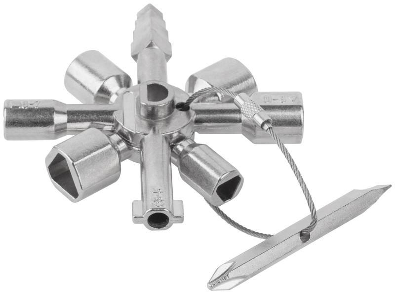 Ключ универсальный для электрошкафов FIT IT 10-в-1 предназначен для открытия электрических и сантехнических шкафов в коммуникациях зданий и транспорта, а также в системах рециркуляции воздуха. Имеет 10 наиболее распространенных форм ключей. Встроенный паз с магнитом позволяет фиксировать биту. Ключ изготовлен из цинкового сплава и обладает длительным сроком службы. Никелевое покрытие предотвращает коррозию. Компактный размер ключа дает возможность носить его в кармане.