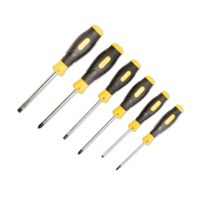 Набор отверток SHTOK 6 шт. блистер 09902 состоит из трех шлицевых (прямой шлиц) и трех крестовых (шлиц Phillips) отверток. Рабочая часть, изготовленная из хром-ванадиевой стали, увеличивает прочность износоустойчивость отверток. Набор поставляется в блистере. Все отвертки оснащены чернеными магнитными наконечниками для удобства монтажа в расположенных вертикально приборах.