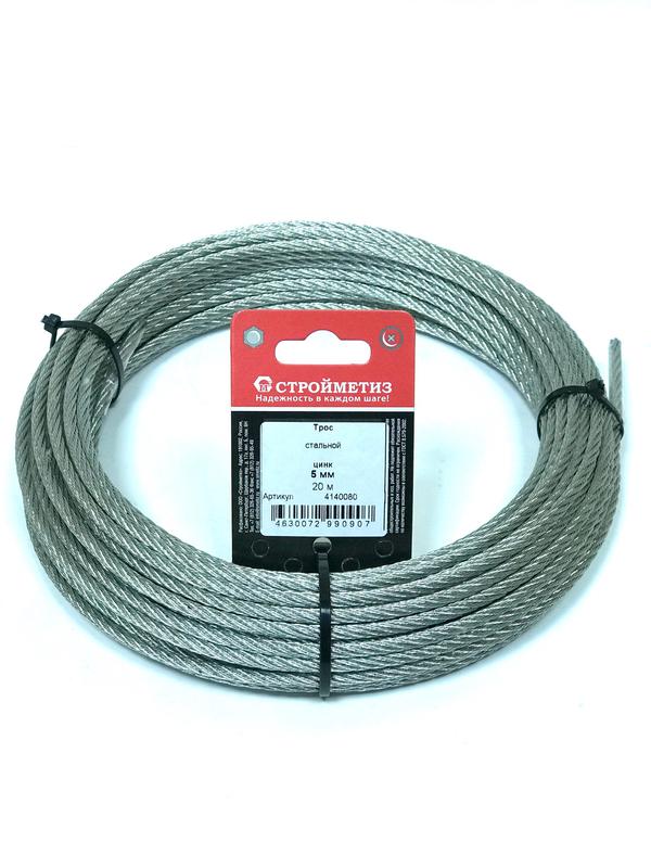 Главная/ Каталог продукции / Материал монтажный / Стальная проволока / Трос стальной 5.0мм DIN 3055 цинк (уп.20м) подвес СТРОЙМЕТИЗ 4140080