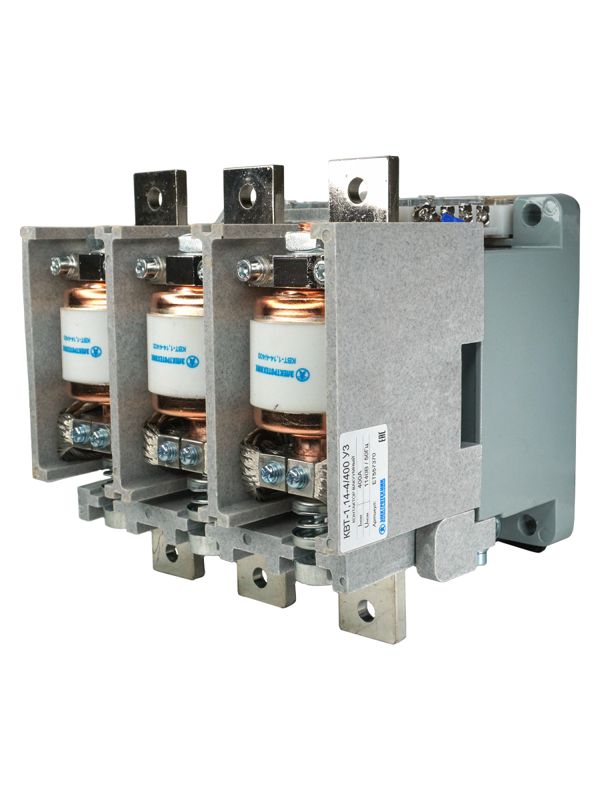 Контакторы вакуумные серии КВТ открытого исполнения с естественны воздушным охлаждением, встраиваемые в комплектные устройства, предназначены для использования в пускателях, станциях управления, для коммутации токов включения и отключения асинхронных электродвигателей с короткозамкнутым ротором и других приёмников электроэнергии в системах дистанционного управления электроприводами с тяжёлым режимом работы в цепи переменного тока 50-60 Гц, напряжением до 1140 В.