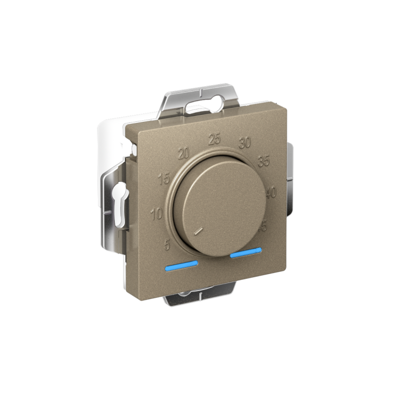 Термостат Systeme Electric (ранее Schneider Electric) серии AtlasDesign электронный для теплого пола, с датчиком, 10 A в цвете шампань обеспечит комфортное регулирование температуры пола и идеально впишется в интерьер помещений. Ном. напряжение: 230 В. Частота: 50 Гц. Электронная защита от перенапряжения. Диапазон регулирования: от +5 до +45 °С. Датчик температуры пола в комплекте (кабель 2,5 м), тип NTC. Степень защиты от пыли и влаги: IP20.