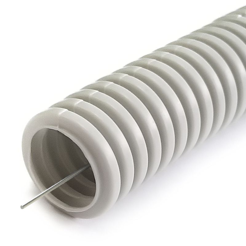 Главная/ Каталог продукции / Системы защиты шланговые / Труба гофрированная пластиковая / Труба гофрированная ПНД легкая d20мм с протяжкой 350 Н безгалоген. (HF) стойкая к УФ сер. (уп.100м) Промрукав PR02.0130