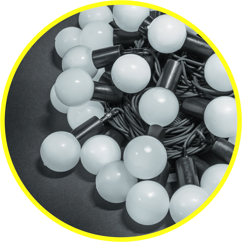Гирлянда «шарики» 8 метров Длина: 8 м Количество светодиодов: 70 шт. Диаметр шарика: 2,4 см Расстояние между шариками: 10 см Соединение в линию: до 3 гирлянд Тип провода: чёрный каучук