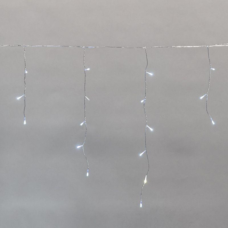 Светодиодная гирлянда Айсикл (Бахрома) представляет собой горизонтальный провод 5 м, на котором располагаются вертикальные нити разной длины от 30 до 60 см. Благодаря своей форме гирлянда оптимально подходит для оформления гардин, ниш, открытых проемов между комнатами, а также крыш, навесов, перил и других элементов зданий и ограждений. Степень защиты IP44 позволяет использовать гирлянду как на открытом воздухе под навесом, так и внутри помещений. На каждой нити располагаются светодиоды, создающие эффект сверкающих сосулек. Цвет свечения – белый. Прозрачный провод изделия делает светящиеся линии более выразительными и образует гармоничную яркую композицию. Особенностью гирлянды является эффект мерцания, который добавляет динамики и создает магическую атмосферу.