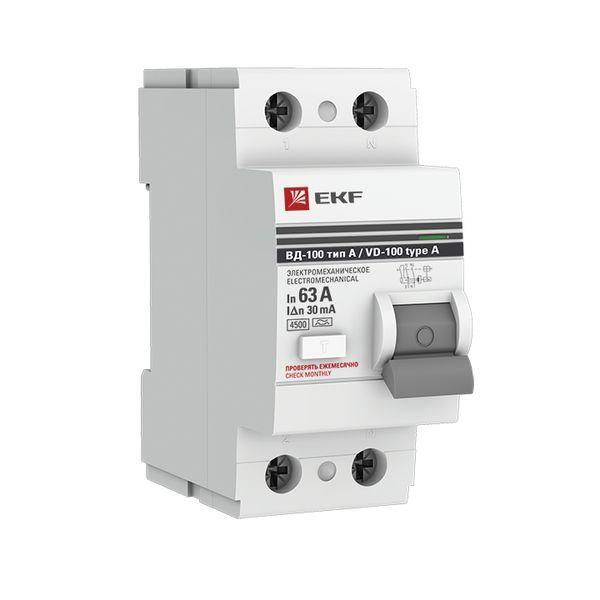 Выключатель дифференциального тока (УЗО) 2п 63А 30мА тип A ВД-100 (электромех.) PROxima EKF elcb-2-63-30-em-a-pro