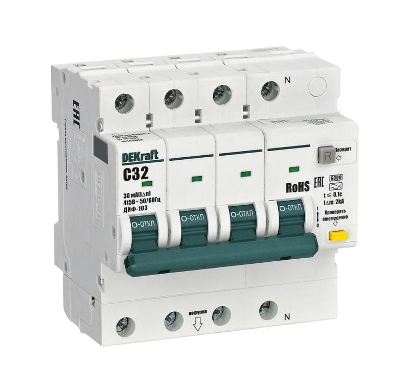 Автоматические выключатели дифференциального тока серии ДИФ-103 6кА NEW Dekraft; 3P+N; номинальный ток 32 А; ном. диф. ток 30 мА; тип диф. расцепителя - AC; кривая отключения - С; Icn, Ics = 6 кА; тип устройства - электронный; монтаж – на DIN-рейку. АВДТ обеспечивают три вида защиты — от короткого замыкания, перегрузки и возникновения утечки тока (в частности, вследствие прикосновения человека к токоведущим частям). АВДТ с отключающей способностью 6кА применяются во вводно-распределительных устройствах (ВРУ), главных распределительных щитах (ГРЩ), осветительных и распределительных установках в общественных, административных, производственных, промышленных и других подобных зданиях.