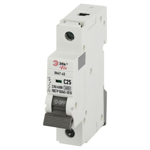 Главная/ Каталог продукции / Устройства защиты, плавкие предохранители, модульные устройства/монтажные устройства / Выключатель автоматический модульный / Выключатель автоматический 1п C 25А 6кА ВА47-63 PRO VA63-1P25C6 Эра Б0063141