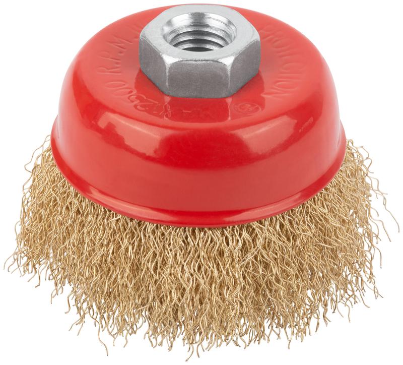 Корщетка-насадка для УШМ КУРС тип «чашка» предназначена для обработки дерева и металла, снятия краски. Форма «чашка» обеспечивает хорошую площадь прилегания к поверхности. Волнистая проволока обеспечивает деликатную зачистку поверхностей. Латунное покрытие проволоки предотвращает коррозию. Гайка с резьбой М14 обеспечивает прочную фиксацию на УШМ.