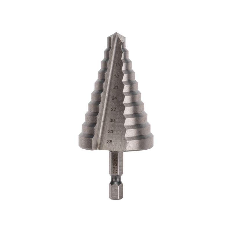 Главная/ Каталог продукции / Электроинструменты и аксессуары для них / Ступенчатое сверло / Сверло по металлу ступенчатое 9.0-36.0мм Kranz KR-12-6604