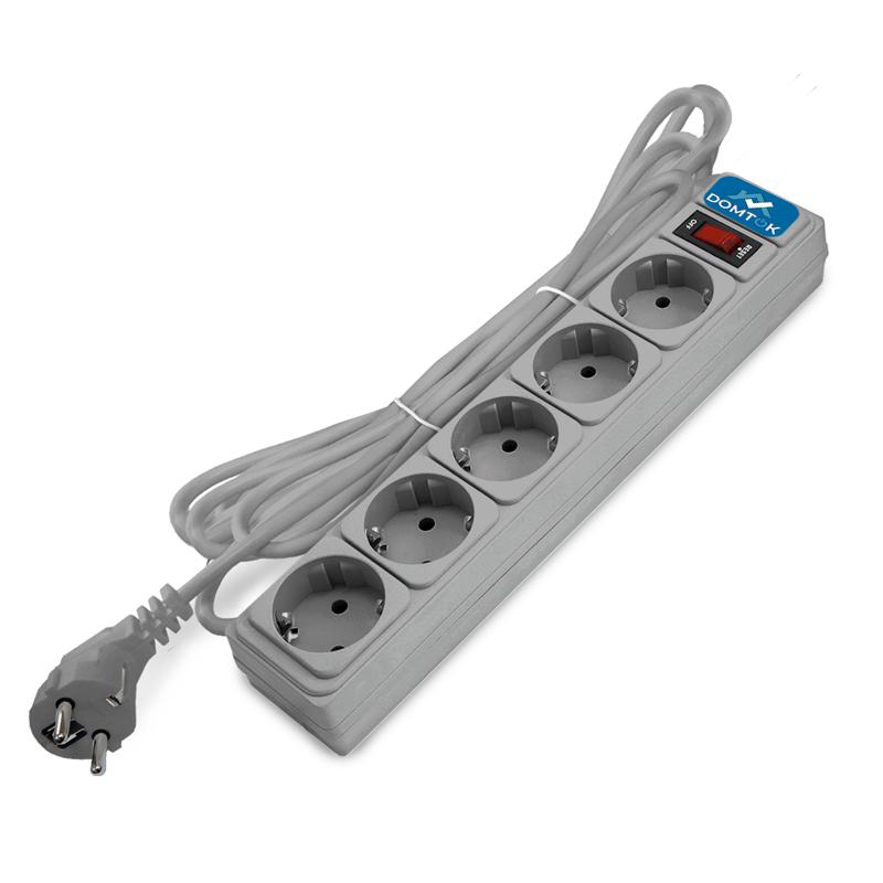 Удлинитель с сетевым фильтром 5х5м с заземл 10А IP20 2.2кВт ПВС 3х1 с выкл. сер. DOMTOK 2534