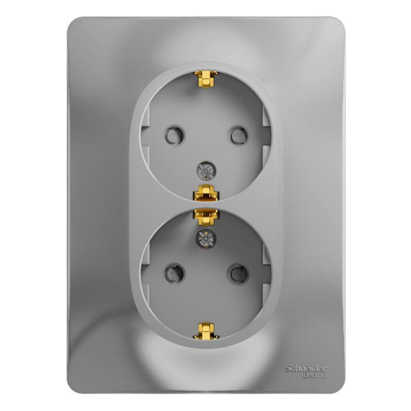 Розетка двойная Systeme Electric (ранее Schneider Electric) серии Glossa (в сборе, цвет алюминий) с заземлением и шторками подходит для сетей 250 В, на ток 16 А. Заземляющий контакт обеспечивает дополнительную защиту от удара электрическим током. При наличии заземления электрический потенциал уходит в землю, защищая человека. Выполнен из материала PС+ASA, стойкого к УФ-излучению и появлению царапин. Двойная розетка позволяет подключить два устройства в одном месте.