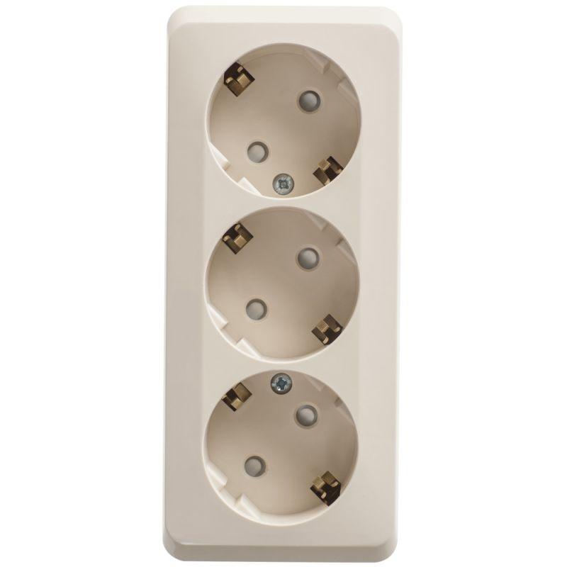 Розетка Systeme Electric (ранее Schneider Electric) ЭТЮД (кремовый, открытой установки) трёхместная с заземлением и шторками предназначена для применения в сетях до 250В, на ток до 16А. Трёхместная розетка позволяет подключить три устройства в одном месте. Шторки и заземление обеспечивают дополнительную безопасность при косвенных прикосновениях. Сделано в России.