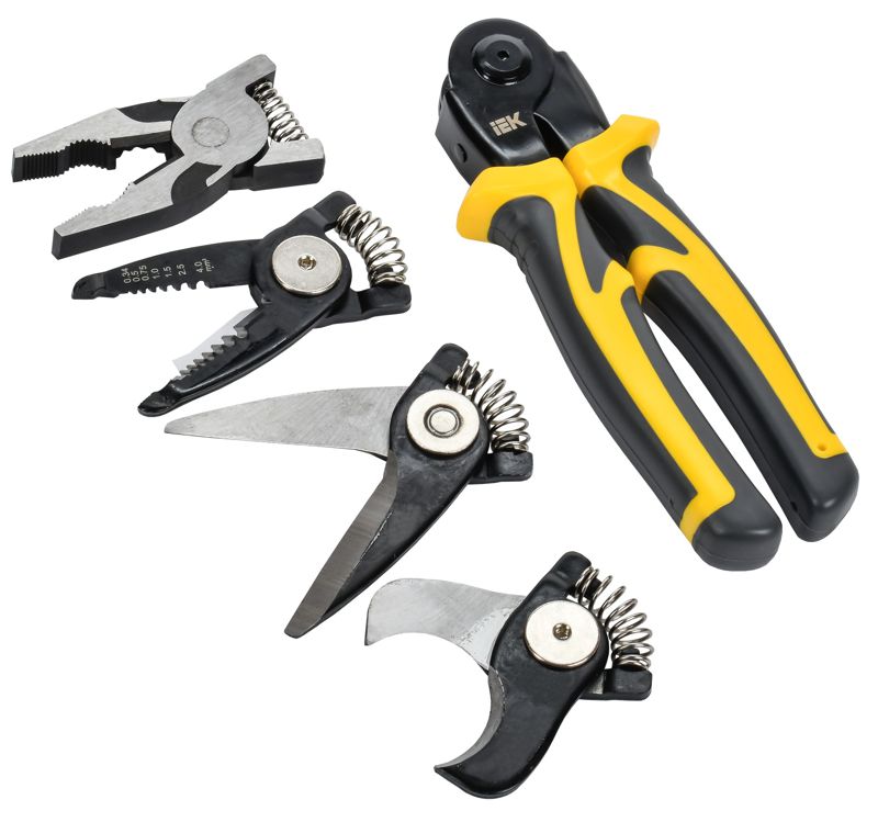 Набор с быстросменными насадками 4 в 1 Насадки в комплекте: Пассатижи с функцией резки и удержания в том числе граненых крепежей Кабелерез для резки небронированного кабеля диаметром до 16 мм. Съемник изоляции для 0,34; 0,5; 0,75; 1,0; 1,5; 2.5; 4.0 мм2 Ножницы для электромонтажных работ.