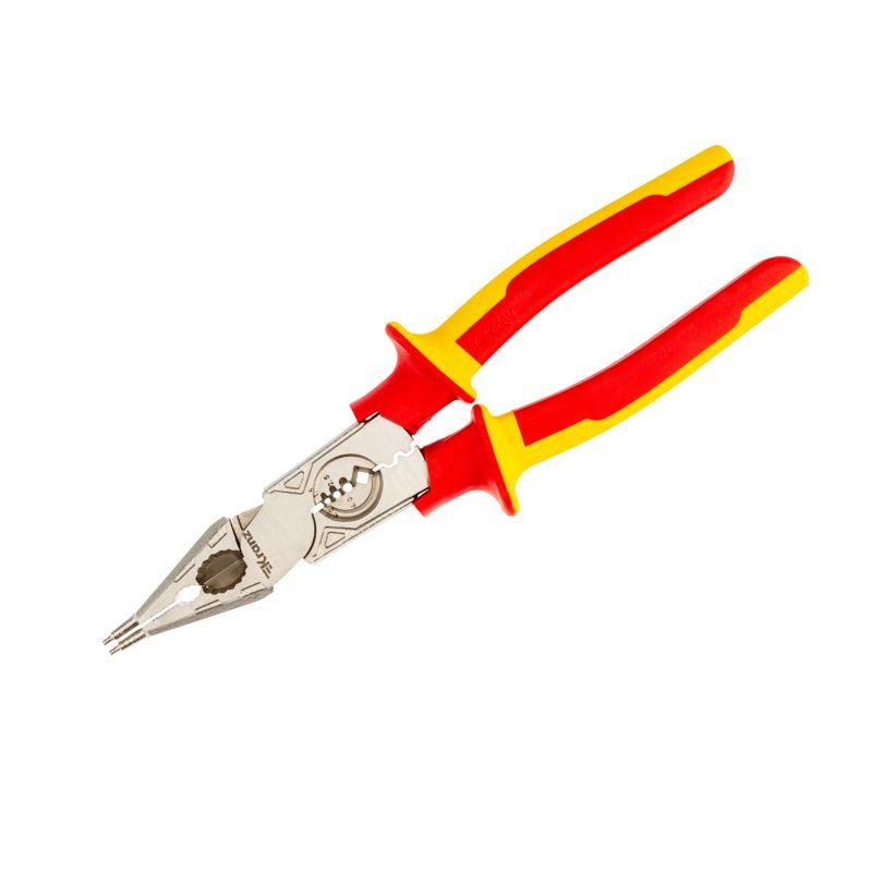 Многофункциональные диэлектрические плоскогубцы – это инструмент на все случаи жизни, включающий в себя: плоскогубцы, бокорезы, инструмент для зачистки кабеля, инструмент для обжима клемм. Плоскогубцы изготовлены из профессиональной хромованадиевой стали (60Cr-V), максимальная твердость – 62HRC. Имеют специальные наконечники для работы со стопорными кольцами. Инструмент подходит для обжима кабеля от 1 до 6 мм2 и для зачистки кабеля от 1,5 мм2 до 4 мм2. Используется для работы с оборудованием напряжением до 1000 В – защищает мастера от поражения электрическим током. Плоскогубцы обладают отличной режущей способностью, подходят для резки/зачистки пластика, медных и мягких проводов, а также для обжима изолированных и неизолированных наконечников. Высокое качество металла позволит сохранить инструмент в отличном состоянии на долгие годы.