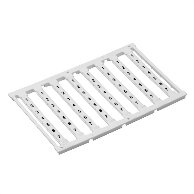 Узкая маркировка для боковой маркировки клемм Push-in: белые маркеры шириной 5 мм, без надписи, с горизонтальной ориентацией. Поставляются в виде карты из 96 штук и применяются для долговечной и наглядной идентификации клемм в электрических сборках и щитах.