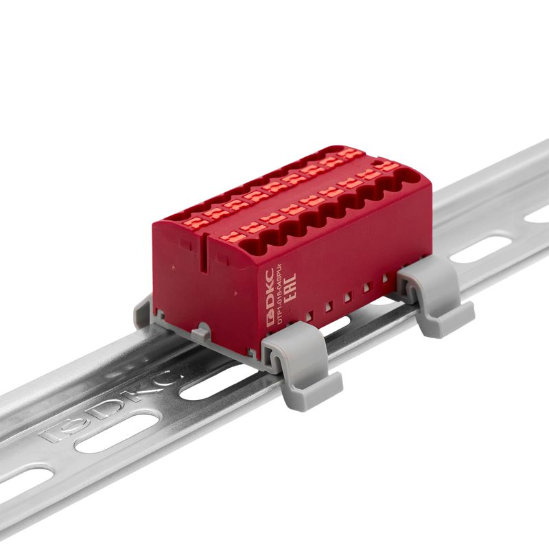 Главная/ Каталог продукции / Колодки клеммные / Проходная клеммная колодка / Блок распределительный с горизонт. адаптером на рейку шир. 35мм зажим push-in 18 точек подключения 2.5кв.мм красн. DKC DTP1-018-04SPUR-H