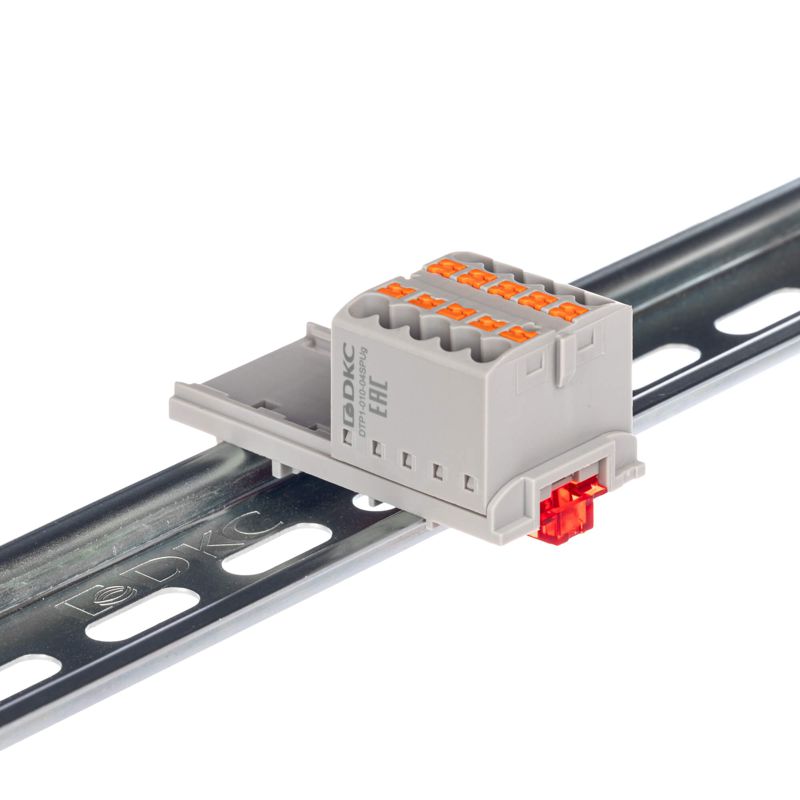 Главная/ Каталог продукции / Колодки клеммные / Проходная клеммная колодка / Блок распределительный с вертикал. адаптером на рейки шир. 15/35мм зажим push-in 10 точек подключения 2.5кв.мм сер. DKC DTP1-010-04SPUG-V