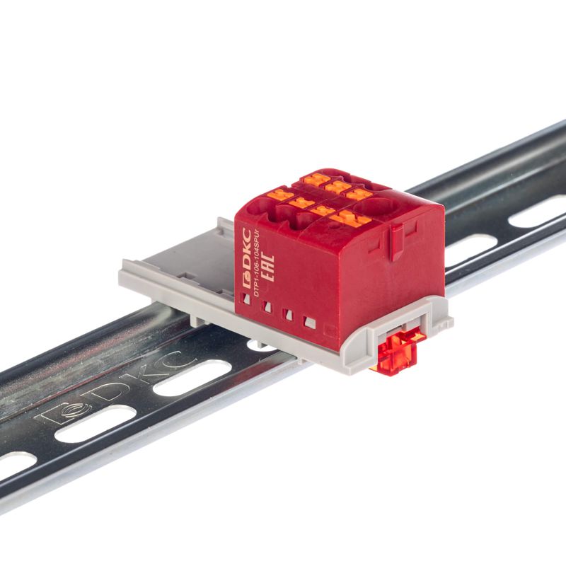 Блок распределительный с вертикал. адаптером на рейки шир. 15/35мм зажим push-in 1 ввод 6кв.мм 6 точек подключения 2.5кв.мм красн. DKC DTP1-106-104SPUR-V