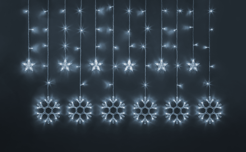 Главная/ Каталог продукции / Светильники / Освещение иллюминационное / Гирлянда светодиодная "Бахрома" "Звезды и снежинки" 95 121 NGF-D032-02 2.5х1м CW IP20 Navigator 95121