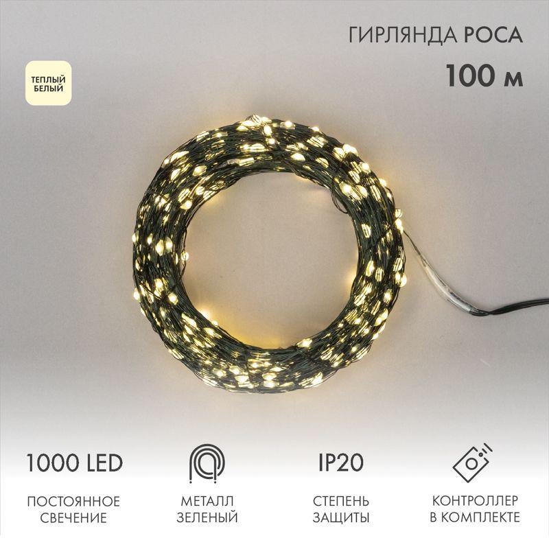 Гирлянда светодиодная "Роса" 100м 1000LED тепл. бел. 7.2Вт 230В IP20 с контроллером провод зел. Neon-Night 303-296